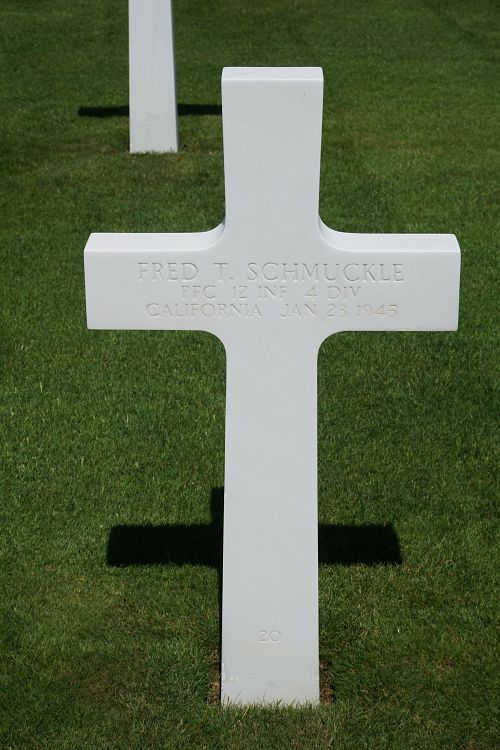 Pfc Fred T. Schmuckle attended high school for 2 years and was a toolmaker before he enlisted in Los Angeles, California on 17 February 1943.Source of information: Peter Schouteten, Danny van der Groen – Company’s / 4ID After Action Reports, www.abmc.gov, www.wwiimemorial.com, www.archives.gov – WWII Enlistment Record, www.ancestry.com - Headstone and Interment Record / U.S. WWII Draft Cards Young Men