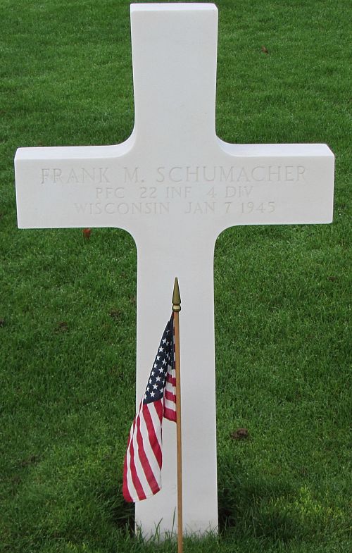 Pfc Frank M. Schumacher Jr. was employed as a mechanic at the Winnebago County Airport. He enlisted on 27 June 1944.He was wounded in action on 6 January 1945.