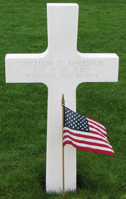 Pvt William D. Sheehan attended Newcastle High School and was a welder before he enlisted at Fort MacArthur, California on 20 April 1944.Source of information: Leo Minne, www.abmc.gov, www.wwiimemorial.com, www.archives.gov – WWII Enlistment Record, www.ancestry.com - 1930 Census / Headstone and Interment Record 1942-1949 / Evans Family Tree, A footsoldier for Patton / Michael C. Bilder James G. Bilder, The 5th Infantry Division in the ETO