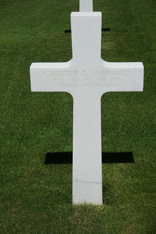 Pfc Chester E. Sheppard was a plasterer before he enlisted on 11 November 1943 in Lubbock, Texas.Source of information: Leo Minne, www.abmc.gov, www.wwiimemorial.com, www.ancestry.com - Headstone and Interment Record / 1920/1930/1940 Census / Williams-Robertson-Treadwell Family Tree / Texas Birth Index, www.80thdivision.com