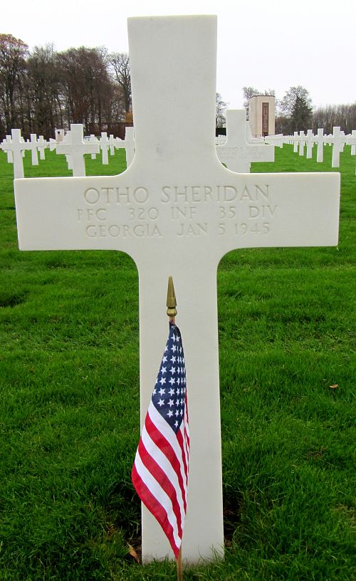 Pfc Otho Sheridan was employed at the Peerless Laundry before he enlisted at Fort McPherson, Georgia on 2 November 1943. He was sent overseas in October 1944.Source of information: Peter Schouteten, www.abmc.gov, www.wwiimemorial.com, www.archives.gov - WWII Enlistment Record, www.ancestry.com - Headstone and Interment Record / U.S. WWII Draft Cards Young Men, After Action Report 35th Infantry Division, www.findagrave.com - MAJ Jimmy Cotton / Backroad traveler