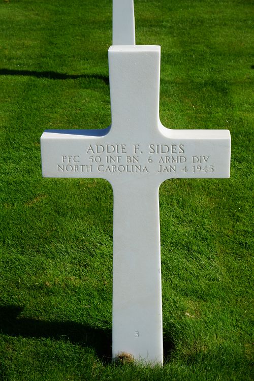 Pfc Addie F. Sides worked at the Cannon Mills textile manufacturing plant before he enlisted at Fort Jackson, South Carolina on 16 February 1942. He was sent overseas in January 1944.He was first buried at the Temporary American Military Cemetery in Grand Failly, France.