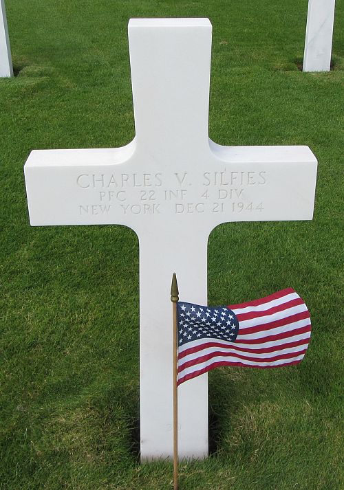 Pfc Charles V. Silfies attended high school for 2 years before he enlisted in Rochester, New York on 9 November 1943.He was first buried at the Temporary American Military Cemetery in Grand Failly, France.