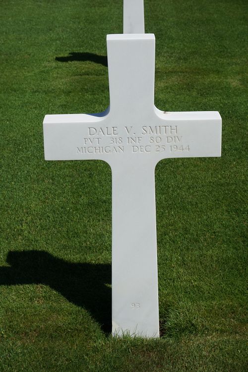 Pvt Dale V. Smith attended high school for one year and worked at the family farm when he enlisted on 9 May 1944. He was sent overseas in October 1944.He was killed by artillery shell fragments.
