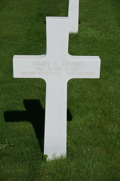 Pfc James G. Spring enlisted at Fort Jackson, Columbia, South Carolina on 14 January 1941.Source of information: Peter Schouteten, Danny van der Groen – Company’s / 4ID After Action Reports, www.abmc.gov, www.wwiimemorial.com, www.archives.gov – WWII Enlistment Record, www.ancestry.com - Headstone and Interment Record / Neely Parks Pedigree Family Tree, www.findagrave.com