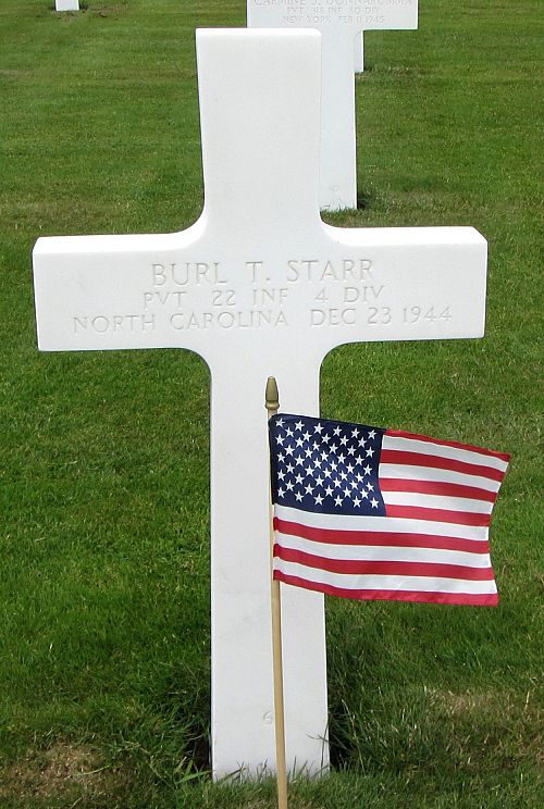 Pvt Burl T. Starr attended high school for four years and was a mechanic, employed by the Great Southern Trucking Company before he enlisted at Fort Bragg, North Carolina on 23 March 1944. He was sent overseas in October 1944.Source of information: Peter Schouteten, Company's / 4ID After Action Reports, www.abmc.gov, www.wwiimemorial.com, www.archives.gov - WWII Enlistment Record, www.ancestry.com - Headstone and Interment Record / Sealock Family Tree, www.findagrave.com