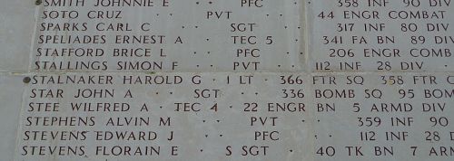 T/4 Wilfred A. Stee's father emigrated from Norway. He was married to Bessie Johnson on 3 November 1943.He was officially declared death one year and one day after he was reported missing in action.