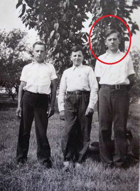 On one picture he poses with his twin brother Andrew on the left and his youngest brother Paul who was the only son to be left to handle the family farm during the war.