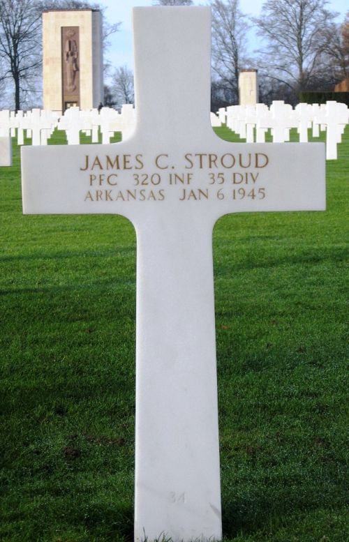 Pfc James C. Stroud enlisted in Arkansas on 5 March 1943 and was sent overseas in June 1944.Source of information: Peter Schouteten, www.abmc.gov, www.wwiimemorial.com, www.ancestry.com - Headstone and Interment Record / U.S. WWII Draft Cards Young Men, After Action Report 35th Infantry Division, www.findagrave.com - Cheryl McKenzie