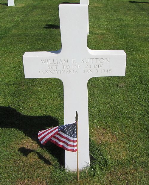 Sgt William E. Sutton attended high school for four years and was employed in a New York hotel before he enlisted in Wilkes Barre, Pennsylvania on 17 April 1941. He was sent overseas in September 1943.He was first buried at the Temporary American Military Cemetery in Grand Failly, France.