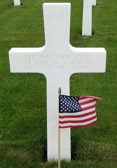Pvt Thomas Swinscoe enlisted in Buffalo, New York on 16 October 1943.On his grave marker at Luxembourg Cemetery is engraved that he served in the 31st Infantry battalion. This is an error.