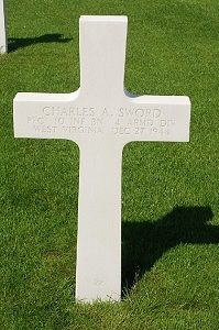 Pfc Charles A. Sword enlisted in Clarksburg, West Virginia on 14 August 1943 and was sent overseas in July, 1944.He was first buried at the Temporary American Military Cemetery of Grand Failly, France.