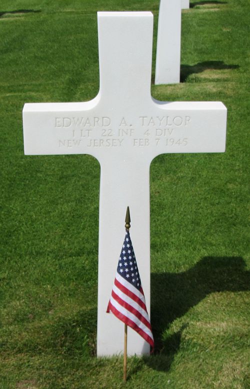 1st Lt Edward A. Taylor graduated from Ridgewood High School in 1936 and attended New York University. He was employed at the Chemical Bank & Trust of New York City.He enlisted in Newark, New Jersey on 14 January 1941. He was stationed for 30 months in England before he was sent into combat in December 1944. While stationed in England he was married to Larrane Allen and the couple had a son.