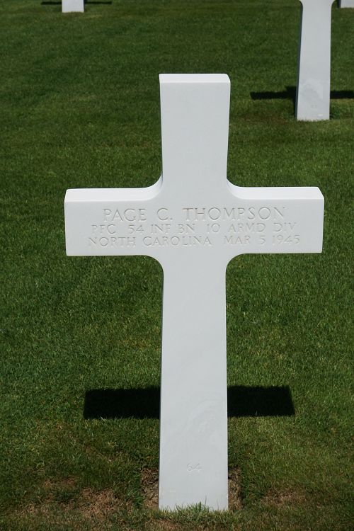Pfc Page C. Thompson attended high school for four years and was a sales clerk before he enlisted in Camp Croft, South Carolina on 22 January 1944.He was killed by artillery shell fragments to his leg.