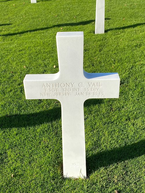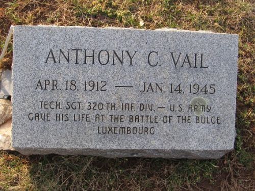 T/Sgt Anthony C. Vail Jr. attended high school for three years and was a manager before he volunteered for the Army of the United States in Newark, New Jersey on 18 June 1942.He died in a hospital in Luxembourg from the effects of artillery shell fragments in his abdomen, which he received during action on 3 January 1945.