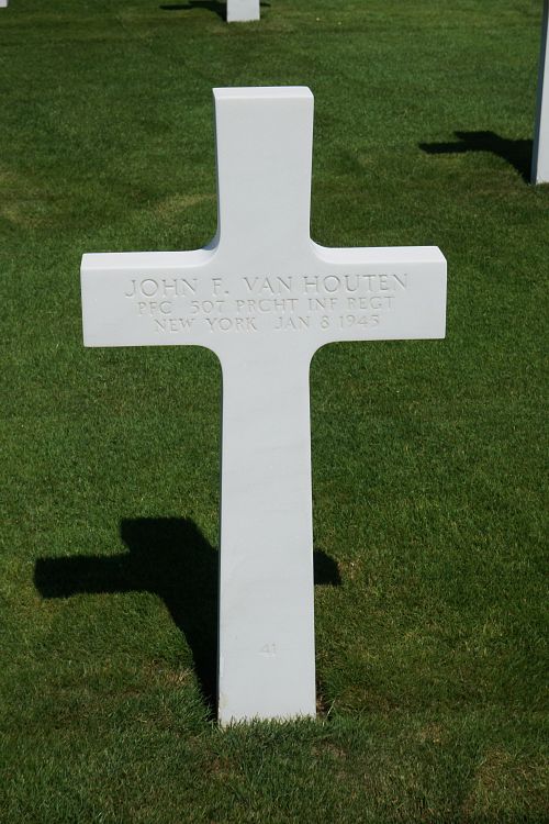 Pfc John F. Van Houten was a stock clerk before he enlisted in New York City, New York on 24 November 1942.He was first buried at the Temporary American Military Cemetery in Grand-Failly, France.
