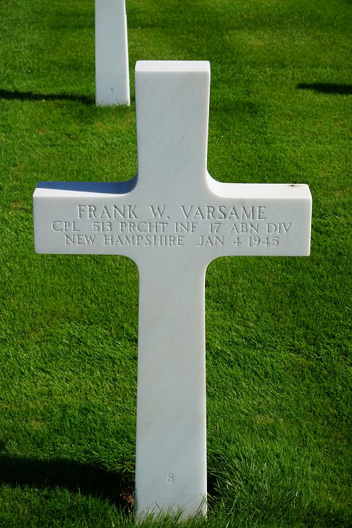 Cpl Frank W. Varsame attended high school for 4 years and was a sales clerk before he joined the National Guard in Manchester, New Hampshire on 24 February 1941.He was first buried at Temporary American Military Cemetery Grand Failly, France.