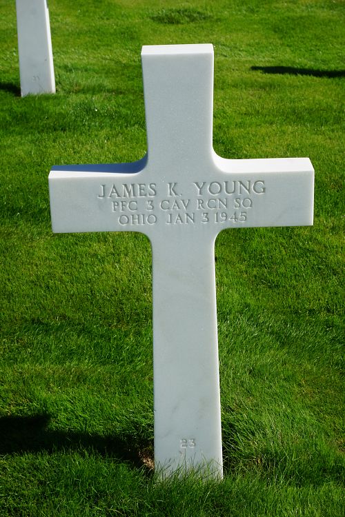 Pfc James K. Young attended high school for one year and was a driver at the Lake Carriers Association before he enlisted in Columbus, Ohio on 19 February 1943. He was sent overseas in July 1944.Sgt. Jack Dulin led an advance patrol to secure an assembly area in the woods for elements of the squadron which were following at a considerable distance. With him were three other men. In their advance, at night, they were ambushed by ten of the enemy who were supported by bazookas and machine guns. The enemy opened fire, killing Pfc Young and seriously wounding two other men.