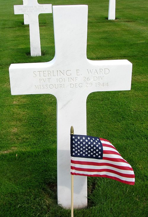 Pvt Sterling E. Ward attended high school for one year and was employed at the St. Louis Cordage Mills before he enlisted at Jefferson Barracks, Missouri on 16 December 1943.Source of information: Peter Schouteten, www.abmc.gov, www.wwiimemorial.com, www.archives.gov - WWII Enlistment Record, www.ancestry.com - Headstone and Interment Record / U.S. WWII Draft Cards Young Men, www.findagrave.com - Coleman / Margie Buchhiet Hartle, www.fold3.com - 26th Infantry Division
