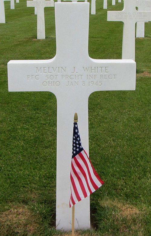 Pfc Melvin J. White was a truck driver for Checker Stores before he enlisted in Cincinnati, Ohio, on 7 June 1943. He was sent overseas in May 1944.He was first buried at the Temporary American Military Cemetery in Grand-Failly, France.