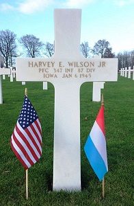 Pfc Harvey E. Wilson attended high school for one year and worked on the family farm before he enlisted at Camp Dodge Herrold, Iowa on 5 July 1943. He was sent overseas in October 1944.He was first buried at the Temporary American Military Cemetery in Grand Failly, France.