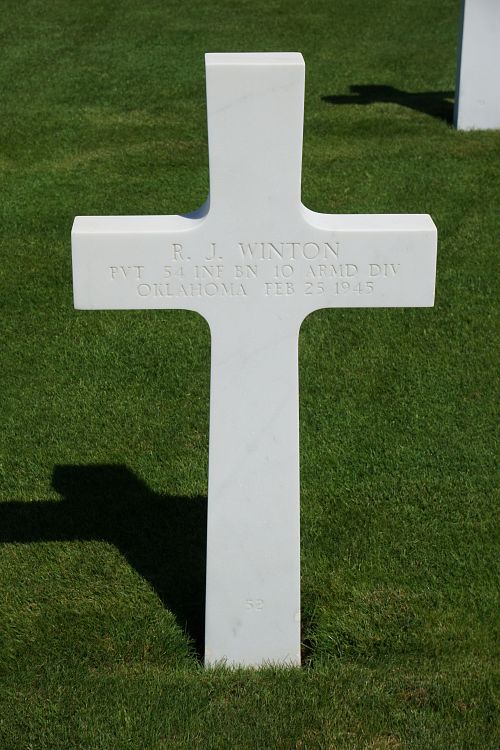 Pvt R. J. Winton was employed at the Retail Grocery Store as a delivery boy before he enlisted in Oklahoma City, Oklahoma in November 1943.Source of information: Peter Schouteten, www.abmc.gov, www.wwiimemorial.com, www.archives.gov - WWII Enlistment Record, www.ancestry.com - Headstone and Interment Record / 1920/1940 Census / U.S. WWII Draft Cards Young Men, www.10tharmored.com, www.findagrave.com - Edith Guynes Stanley / Jean