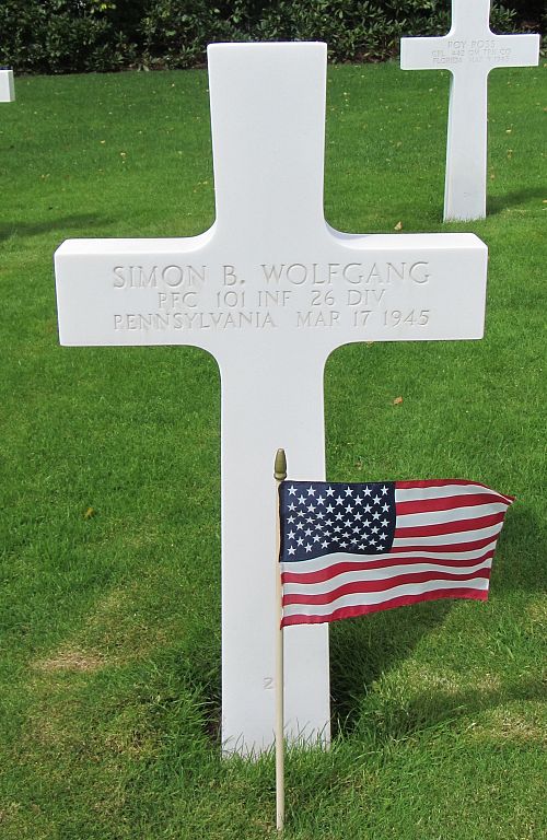 Pfc Simon B. Wolfgang attended high school for four years and was a mechanic and repairman before he enlisted in Erie, Pennsylvania on 7 August 1944.He was killed by artillery shell fragments to his head.