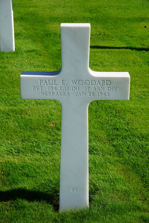 Pvt Paul E. Woodard was a driver before he enlisted in Camp Dodge Herrold, Iowa on 14 April 1943.He was first buried at the Temporary American Military Cemetery in Grand Failly, France.
