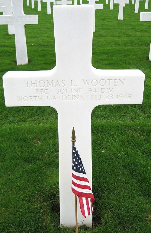 Pfc Thomas L. Wooten attended high school for 2 years and worked on a farm before he enlisted at Camp Croft, South Carolina on 8 August 1944.Source of information: Peter Schouteten, www.abmc.gov, www.wwiimemorial.com, www.archives.gov - WWII Enlistment Record, www.ancestry.com - U.S. Draft Cards Young Men, http://www.94thinfdiv.com