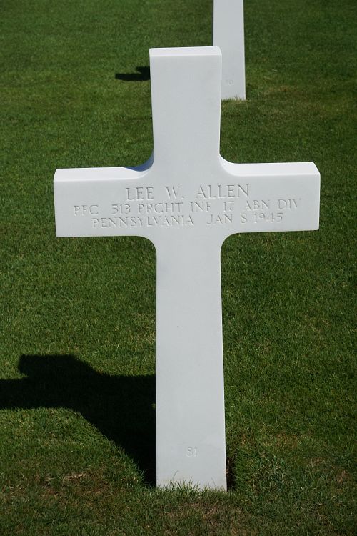 Pfc Lee W. Allen attended attended Berwick High School and worked in the production of beverages. His grandfather and grandmother James Trash and Alice C. Trash were his legal guardians.He joined the Regular Army in Harrisburg, Pennsylvania on 12 September 1940. He served three years in the Quartermaster Corps at Edgewood Arsenal, Maryland before volunteering for the paratroopers.