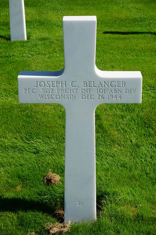 Pfc Joseph C. Belanger attended St. Mary's School and the Rhinelander High School.He joined the National Guard in Rhinelander, Wisconsin on 15 October 1940. He became a member of Rhinelander's Company B and left with the company in 1940. He was assigned to paratroop training and received his schooling in that branch of service at Fort Benning, Ga.