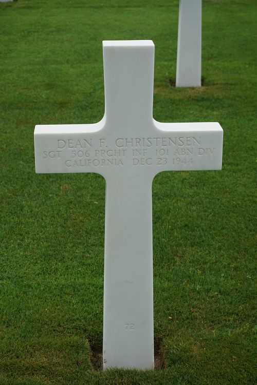 Sgt Dean F. Christensen attended high school for three years and was employed at Lockheed Aircraft Company in Burbank, California.He was first buried at Temporary American Military Cemetery Grand Failly, France.
