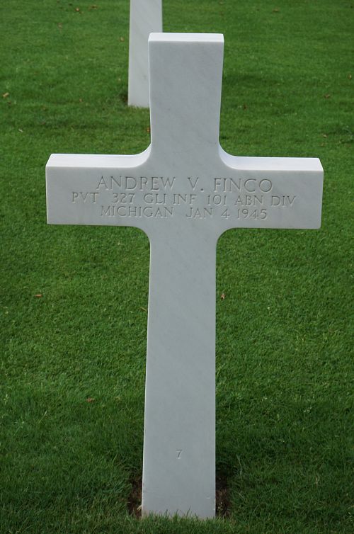 Pvt Andrew V. Finco enlisted in Kalamazoo, Michigan on 15 March 1943. He landed in France with one of the first airborne divisions with the glider troops on D-Day and fought through Holland to Belgium in the invasion. He was previous wounded two times. He had been wounded in the right arm and was sent to a hospital in England. Pvt Finco served overseas a year and a half. His cousin Pvt Billie Ceccon also served in the armed forces and they met in England while on furlough.