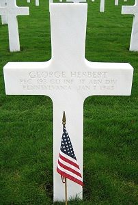 Pfc George Herbert was a miner before he enlisted in Allentown, Pennsylvania on 8 April 1943. He volunteered for the airborne infantry after basic training and obtained his wings at Camp Forrest, Tennessee. He was sent overseas in August 1944.He was first buried at theTemporary American Military Cemetery of Grand Failly, France.