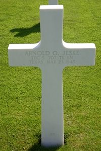 T/5 Arnold O. Jeske enlisted at Camp Wolters, Texas on 13 March 1942.T/5 Jeske was taken prisoner in the vicitiny of Marnach, Lexembourg on 17 December 1944 and died in the Prisoner of War Camp Stalag 4B in Mühlberg, Germany.