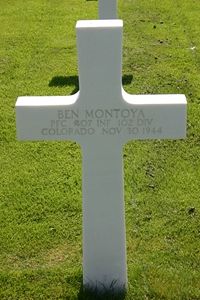 Pfc Ben Montoyawas a laborer before he enlisted on 23 November 1942 at Fort Morgan, Colorado. He trained at Camp Maxey, Texas and Camp Polk in Louisiana.Don Van Vleet sent us the following account from his father, who was with Pfc Montoya when he was killed: