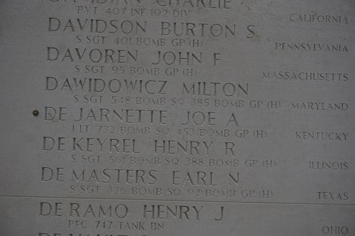 De Jarnette’s name is recorded on the Walls of the Missing at Netherlands American Cemetery. A rosette is placed next to his name to indicate he has been accounted for.