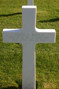 Cpl John A. Bange had been employed at the Bethlehem Steel Company before he enlisted on 22 March 1943 in New York City, New York.Source of information: Peter Schouteten, www.wwiimemorial.com, www.archives.gov, www.ancestry.com - U.S. WWII Draft Cards Young Men