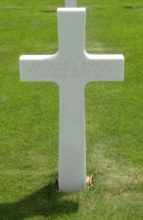 Pvt Raymond L. Carson was aboard a Waco Glider loaded with jeeps. Approaching the landing zone enemy ground fire shot off the left wing and it crashed.The casualties were initially buried on the cemetery of the St. Petrus Banden in Oisterwijk.