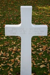 Sgt George J. Meyers was shot by snipers while leading his platoon.His brother, James J. Meyer,s was killed on 18 December 1944 and is buried next to him.