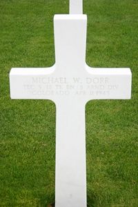 T/5 Michael W. Dorr enlisted twice. From 1935-1937 he was an engineer in the Army. Then he came home, got married, and had three daughters. He re-enlisted in April 1944.He was a member of a patrol, sent out to evacuate prisoners. When the other members of the patrol dismounted from the half-track, he remained at the machine gun to cover their advance. The dismounted members of the patrol met fifteen German soldiers and Cpl Dorr fired several bursts overhead to induce surrender. Other enemy troops then opened fire. Engaging three tanks as well as the machine guns, he fought courageously to protect his companions until mortal wounded.