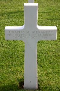 Pfc Charles M. Alexander graduated from Lilbourn High School in 1940 and was employed at National Broach and Machine Company.He was wounded by artillery shell fragments in his back on 7 June 1944. For this wound het was awarded the Purple Heart Medal a first time.