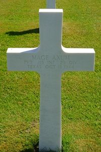 Pvt Mage Axum was a welder before he enlisted in Tyler, Texas on 27 January 1944.The mission report of his unit states that on 18 October 1944 the company made a night raid on the enemy held town of Buscherheide. Extremely heavy fire was encountered from artillery, high velocity weapons and machine guns. After the raid the troops withdrew from the town. The objective was to destroy a bridge but the mission failed. After reorganization, Pvt Bernal, Sgt Long, Pvt Axum and Pvt Brooks were missing from the company. The remains of Sgt Long, Pvt Axum and Pvt Brooks were recovered and interred at Ardennes Cemetery. Pvt Axum and Pvt Brooks are still buried there. The remains of Pvt Bernal were never recovered.