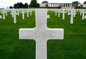 S/Sgt Ernest J. Triffo graduated from Central High School and was employed by Ansco before he enlisted in Albany, New York on 19 February 1941.He was reported wounded in action on the leg by shrapnel on 7 August 1944 for which he was awarded the Purple Heart Medal. Sgt Triffo had just moved his infantry unit into position to guard the town of Vire against flank and rear counterattacks when he was struck by a mortar shell fragment. "I never heard the shell that hit me", he said. "The medics were nearby and took care of me immediately." He was sent to England for recovery.