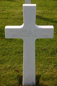 Pvt Bernardo A. Apostol enlisted in Philadelphia, Pennsylvania on 26 January 1944.Source of information: Peter Schouteten, Carla Mans, www.abmc.gov, www.wwiimeorial.com, www.archives.gov - WWII Enlistment Record, www.ancestry.com - U.S., Headstone and Interment Records for U.S. Military Cemeteries on Foreign Soil / Marcos Albright Family Tree, 1940 Census / U.S. WWII Draft Cards Young Men / U.S. Veteran Compensation Application Files, www.ivydivisionww2.com