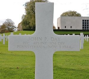 During the initial attack on Standdaarbuiten, Pfc Day who manned a BAR automatic rifle, was the only casualty of 2nd Platoon. He was in a field in his slit trench when a German soldier advanced and fired. Pfc Day was killed instantly by rifle fire at close distance.