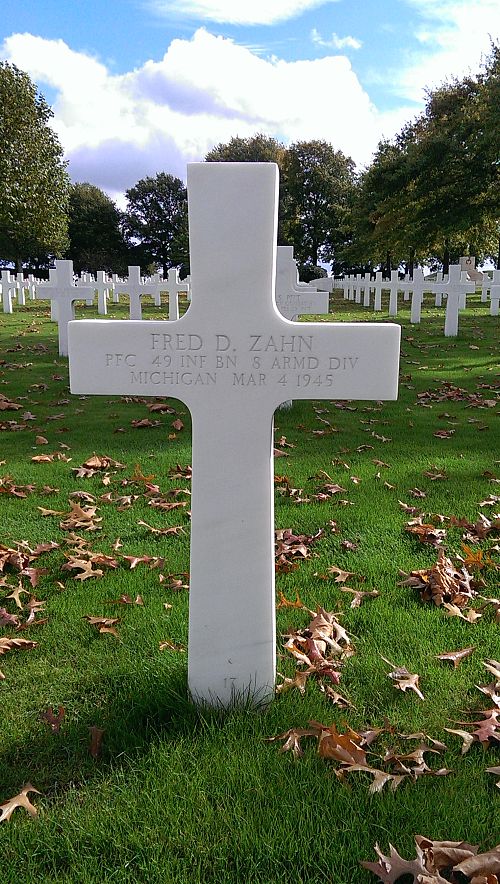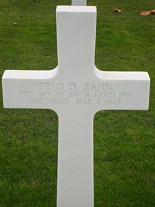 Pfc Fred D. Zahn was a 1943 graduate of Arthur Hill High School where he was in the band. He was employed by the 1st Presbyterian Church office.Source of information: Peter Schouteten, Terry Hirsch, www.wwiimemorial.com, www.8th-armored.org, www.ancestry.com - U.S Census Records 1910 -1930 / 8th Armored Division "Thundering Herd" Unit History, WWII Draft Card