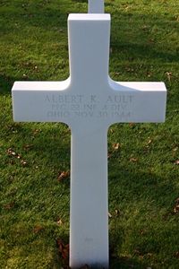Pfc Albert K. Ault was employed at the Toronto plant of the Follansbee Steel corporation before he enlisted in Cleveland, Ohio on 1 August 1941.He was reported wounded in action on 25 November 1944 and died five days later.