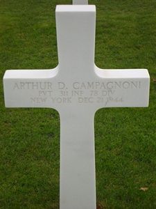 Pvt Arthur D. Campagnoni enlisted at Fort Dix, New Jersey on 1 April 1944.He was shot on 15 December 1944 by a sniper in the Hürtgen Forest, Germany while eating breakfast. He died six days later.