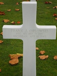 Pfc Frank J. Orlowski was hit in the shoulder by small arms fire.He was first buried at the Temporary Military Cemetery of Breuna, Germany.